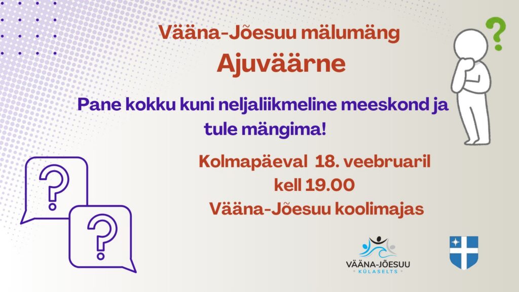 Jaanuarikuu mälumäng toimub kolmapäeval 21. jaanuaril ja asukoht on tavapäraselt Vääna-Jõesuu koolimajas ning algusaeg ikka kell 19.00.