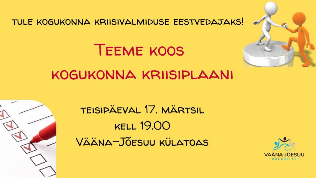 Märtsikuus, 17. kuupäeval kohtume taas külatoas ja jätkame kriisiplaani koostamise ning muude kriisivalmiduse tegevustega.