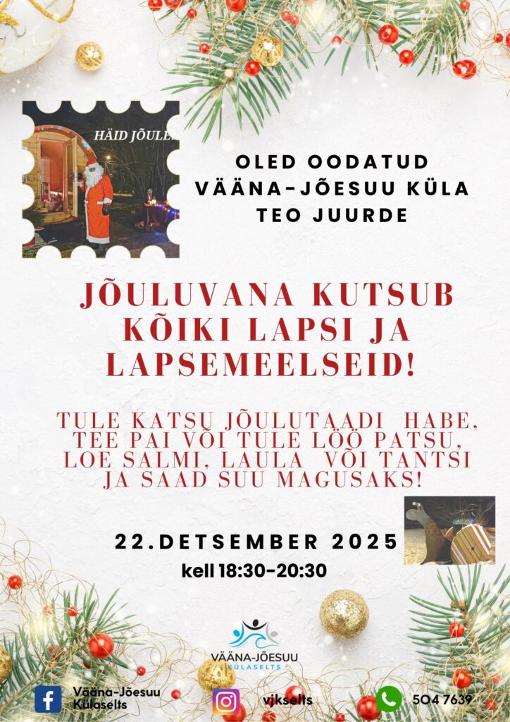 Jõuluvana ootab kõiki lapsi ja lapsemeelseid esmaspäeval 22. detsembril kell 18.30-20.30 külaseltsi teo juures.