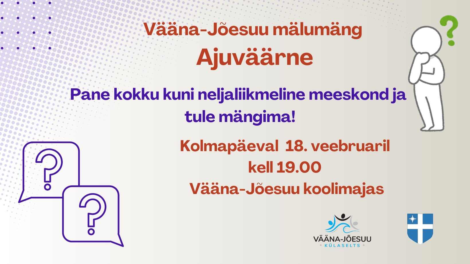 Veebruarikuu mälumäng toimub kolmapäeval 18. veebruaril tavapäraselt Vääna-Jõesuu koolimajas ning algusaeg ikka kell 19.00.
