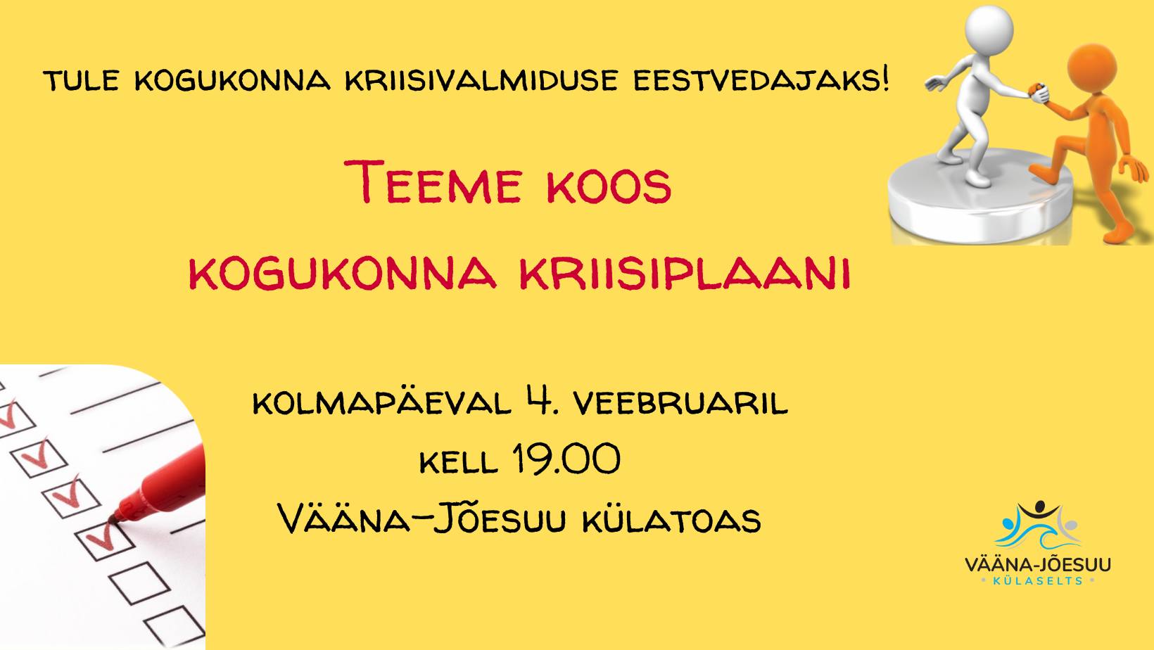 Kohtume 4. veebruaril kl 19.00 üle pika aja külamajas ja vaatame üle, kuhu oleme oma kriisiplaaniga jõudnud ning mida järgmisena ette võtame.