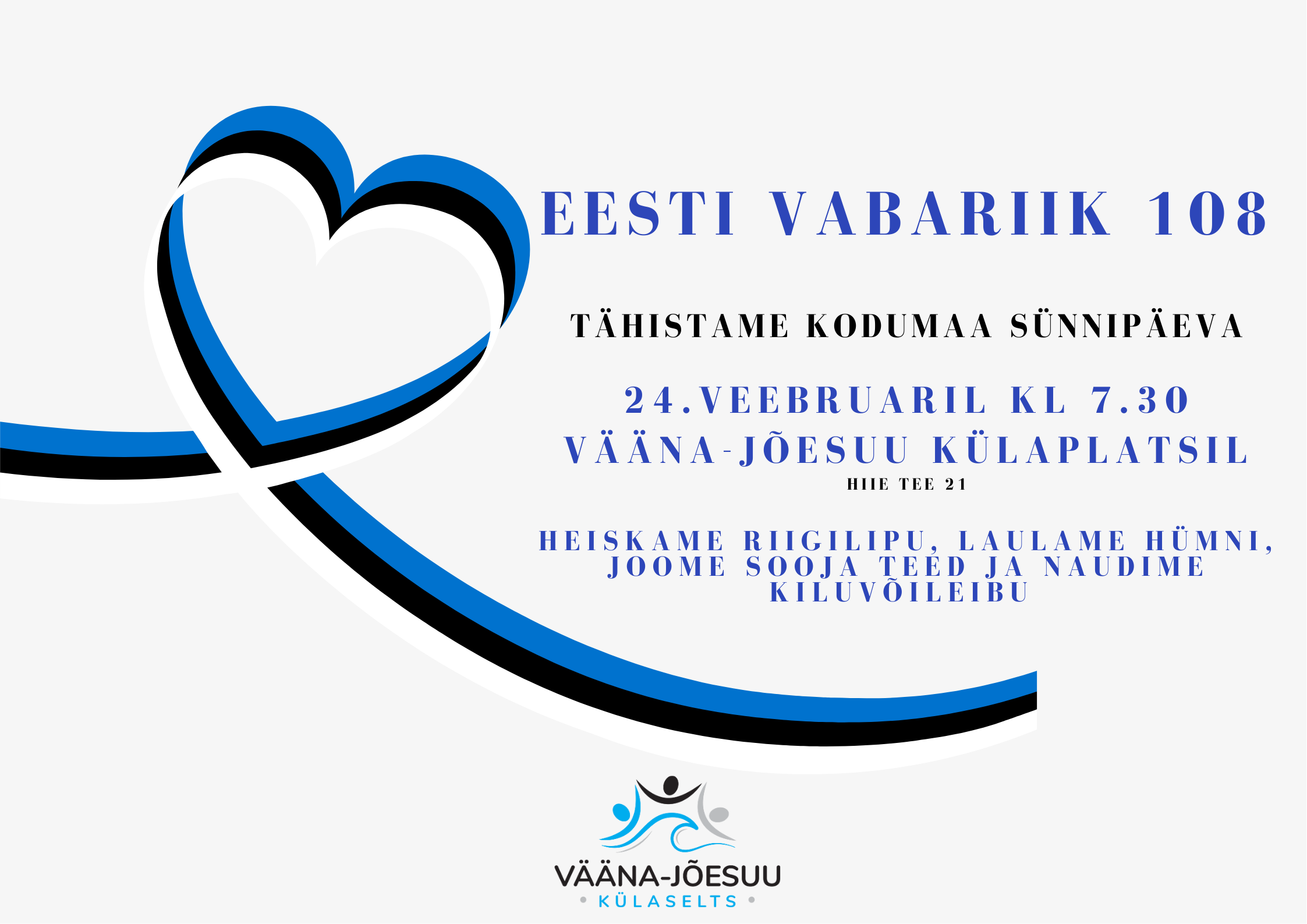 Tähistame üheskoos Vääna-Jõesuus külaplatsil Eesti Vabariigi 108. aastapäeva 24. veebruaril algusega kl 7.30 Vääna-Jõesuu külaplatsil koolimaja taga männimetsas.