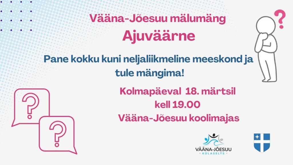 Novembrikuu mälumäng toimub kolmapäeval 19. novembril kell 19.00 tavapäraselt Vääna-Jõesuu koolimajas.